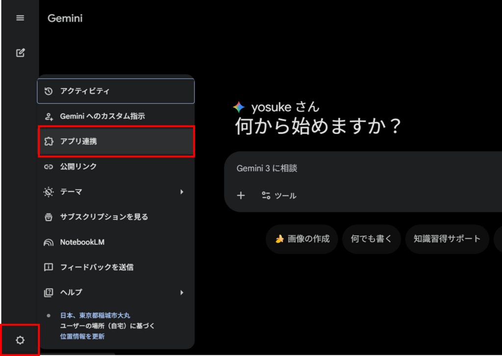 「まずはコストをかけずに、個人のGoogleアカウントで試してみたい」という方のために、無料版Geminiでの連携方法を解説します。 ※Google Workspaceアカウント(企業用)の場合、管理者が機能を制限していると利用できない場合があります。